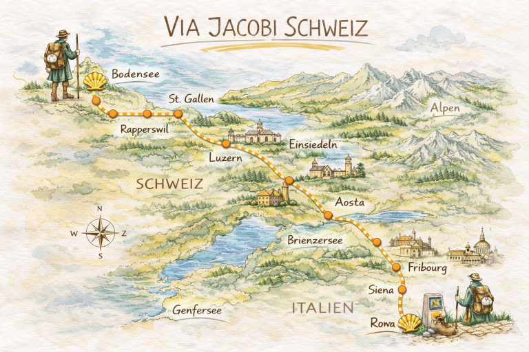 Die Via Jacobi ist Teil des europäischen Jakobswegenetzes und führt quer durch die Schweiz – vom Bodensee bis nach Genf. Sie verbindet Seen, sanfte Hügel und alpine Ausblicke mit historischen Klöstern und kleinen Orten.