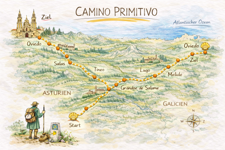Der Camino Primitivo gilt als einer der ältesten Jakobswege und beginnt in Oviedo. Er führt durch das bergige Inland Nordspaniens und ist körperlich anspruchsvoller als viele andere Routen.