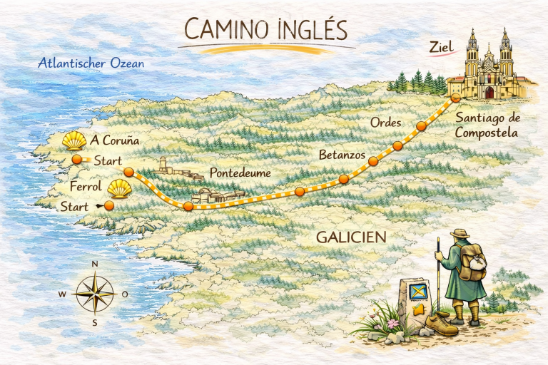 Der Camino Inglés startet traditionell in Ferrol oder A Coruña und ist deutlich kürzer als die klassischen Hauptrouten. Er war einst der Weg für Pilger aus Nordeuropa, die per Schiff ankamen.