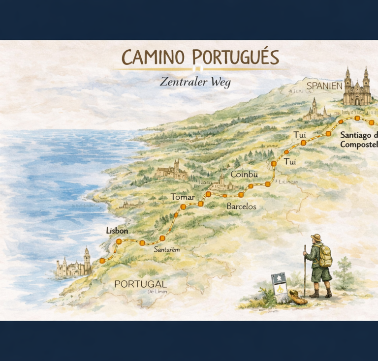 Der Camino Portugués beginnt meist in Lissabon oder Porto und führt durch Portugal bis nach Santiago de Compostela. Besonders beliebt ist der Abschnitt ab Porto, der in etwa zwei Wochen gut zu gehen ist.