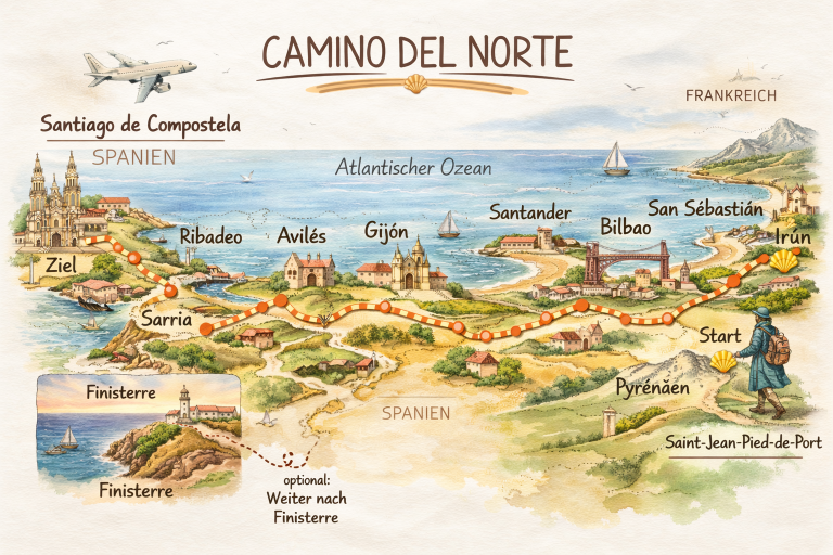 Der Camino del Norte verläuft entlang der spanischen Atlantikküste von Irún bis nach Santiago de Compostela. Er ist landschaftlich besonders abwechslungsreich und führt über Klippen, Strände und durch kleine Küstenorte.