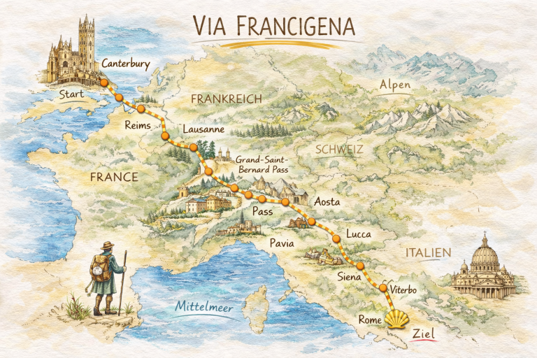 Die Via Francigena ist eine historische Pilgerroute, die von England über Frankreich und die Schweiz bis nach Rom führt. Sie verbindet mittelalterliche Städte, Alpenpässe und weite Landschaften Italiens.