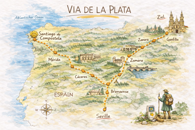 Die Via de la Plata beginnt in Sevilla im Süden Spaniens und führt über rund 1.000 Kilometer nach Santiago de Compostela. Sie ist deutlich weniger frequentiert als der Camino Francés und führt durch weite, offene Landschaften.